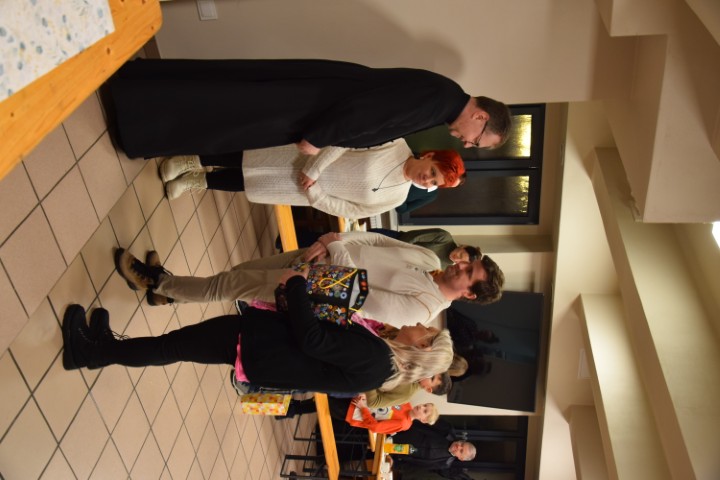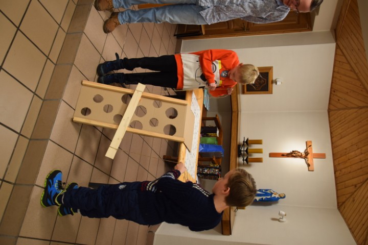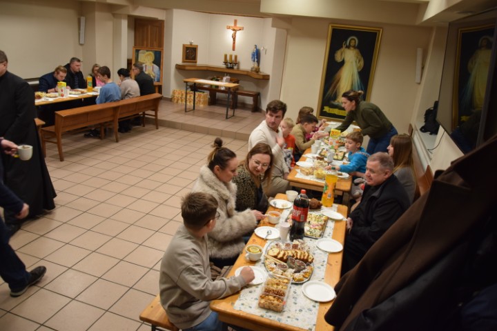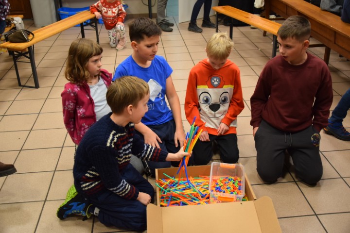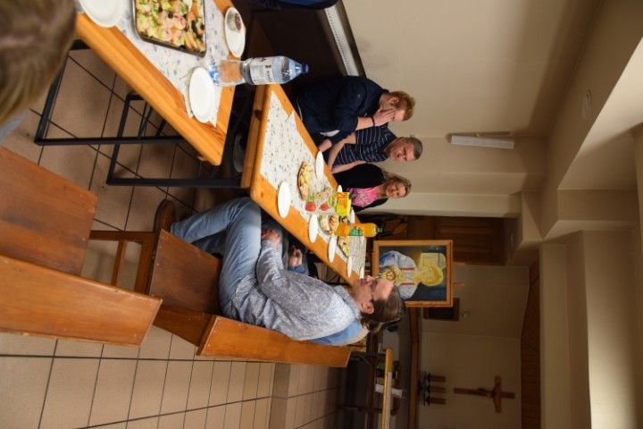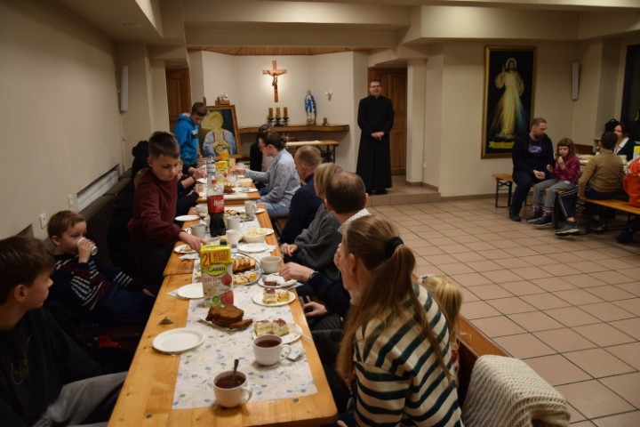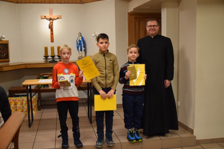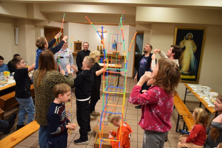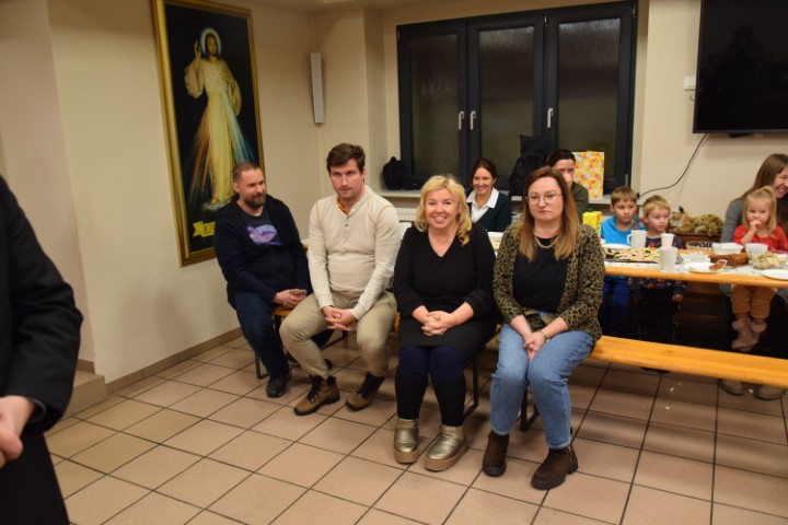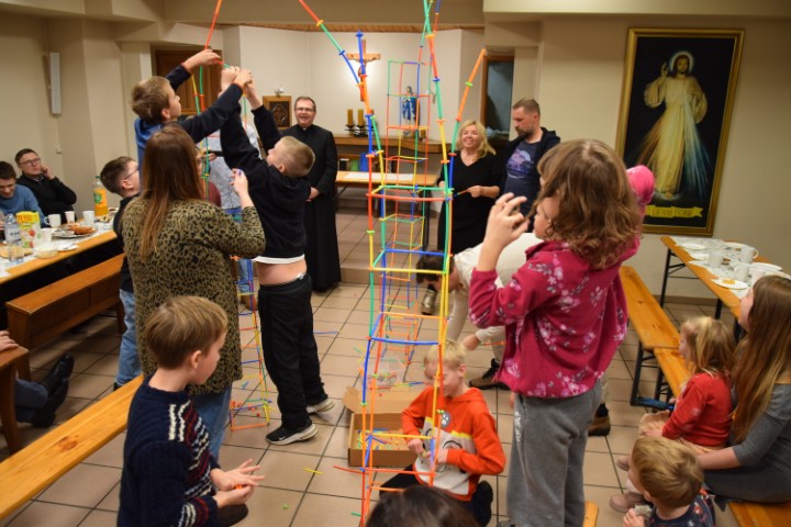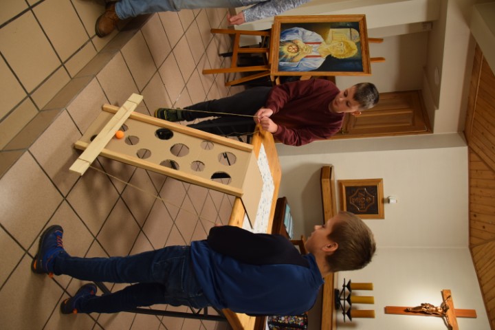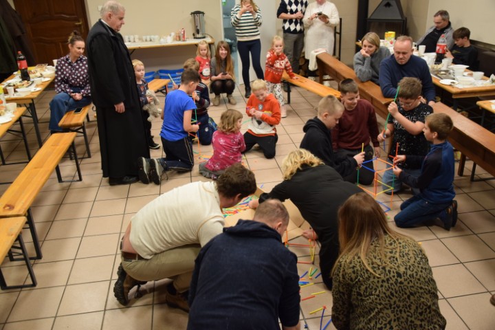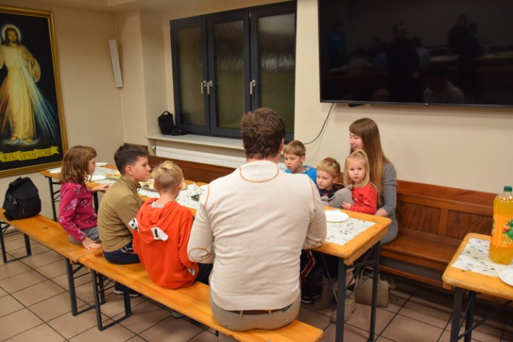 Następnie spotkaliśmy się przy stole, w krypcie pod kościołem. Mogliśmy delektować się pysznościami przygotowanymi przez mamy. Ministranci otrzymali upominki i nagrody za wytrwałą służbę, a nowi kandydaci i ministranci – dyplomy. Wzięliśmy tez udział w rodzinnej rywalizacji zręcznościowej – drużyn ministranckich i rodziców. Zabawy i śmiechu było co niemiara